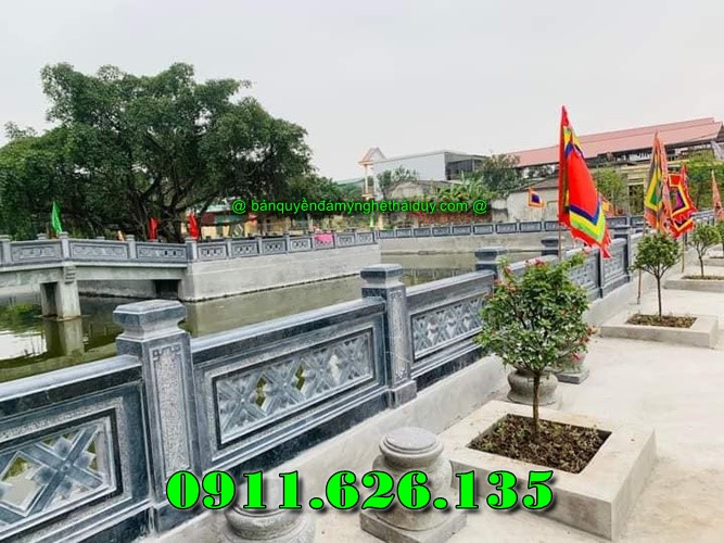 Hàng rào thường được làm từ đá xanh nguyên khối, chạm khắc hoa văn đơn giản hoặc tinh xảo tùy yêu cầu. Thiết kế có thể là lan can đá, tường kín hoặc kết hợp cột đá tạo sự chắc chắn và thẩm mỹ cao.