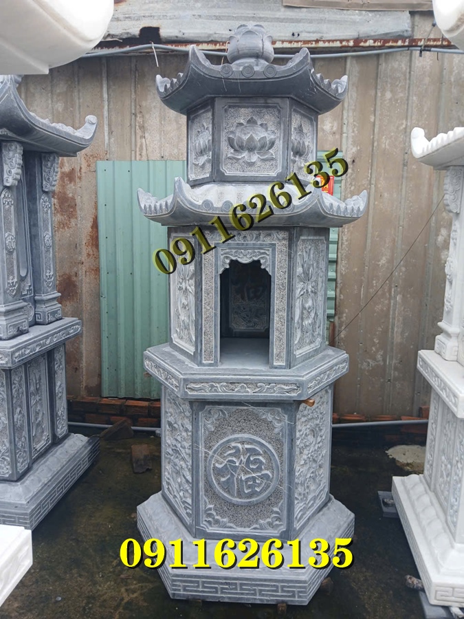 Tháp đá tròn mang ý nghĩa phong thủy sâu sắc, tượng trưng cho sự viên mãn, trọn vẹn và vĩnh hằng. Đây là kiểu tháp được nhiều gia đình, chùa chiền lựa chọn để thể hiện sự tôn kính và tâm nguyện trường cửu. - Tháp đá lục giác