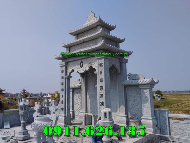 Cổng đá: Cổng tam quan, cổng mái vòm khắc họa tiết truyền thống.
