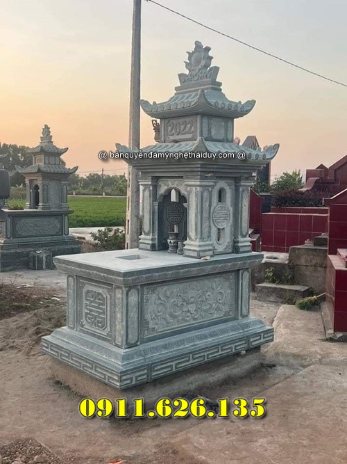 Mộ đôi dành cho hai người, thường là vợ chồng, thể hiện sự gắn kết vĩnh cửu. Thiết kế đối xứng với mái che và chạm khắc hoa văn tạo nên sự trang trọng.