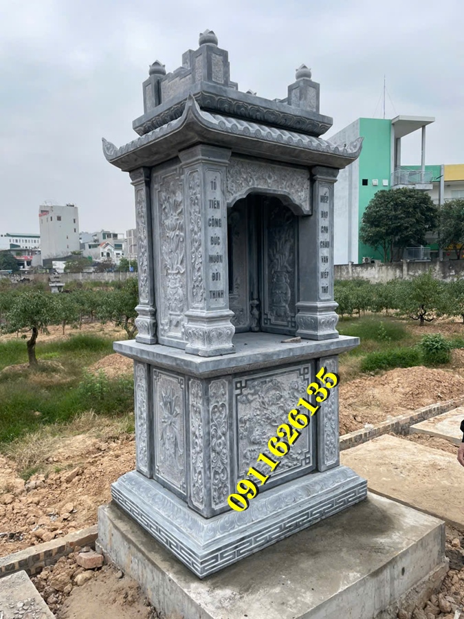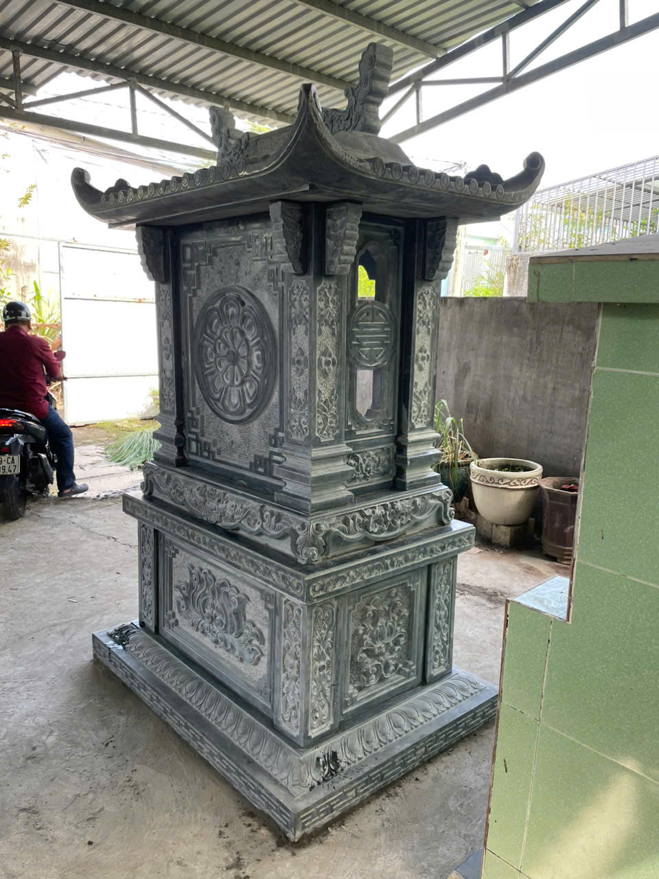 Am thờ tro cốt bằng đá là một công trình kiến trúc tâm linh nhỏ được làm từ đá tự nhiên nguyên khối, dùng để bảo quản, an vị và thờ cúng hũ tro cốt của người đã khuất sau khi hỏa táng, thường đặt tại sân vườn gia đình, khu nghĩa trang, đền chùa hoặc nơi trang nghiêm trong khuôn viên thờ tự. “Am” trong tiếng Việt chỉ ngôi nhà nhỏ để thờ cúng, còn “tro cốt” là phần còn lại sau khi hỏa táng người mất, vì vậy am thờ tro cốt đá vừa là nơi trang trọng để tưởng nhớ, thể hiện lòng hiếu kính, vừa là chốn an nghỉ thanh tịnh cho linh hồn người khuất bóng. Đây không chỉ là biểu tượng của lòng thành kính với tổ tiên và người đã khuất, mà còn mang ý nghĩa phong thủy sâu sắc, giúp cân bằng năng lượng, đem lại sự bình an cho gia đình và thể hiện truyền thống văn hóa “uống nước nhớ nguồn” của người Việt. Các am thờ này thường được thiết kế với nhiều kích thước khác nhau phù hợp nhu cầu và không gian, ví dụ như chiều rộng khoảng 40–100 cm, chiều cao khoảng 80–167 cm và chiều sâu khoảng 40–90 cm tùy theo số lượng hũ tro cốt cần an vị và phong thủy đặt am. Chất liệu đá để làm am thờ tro cốt rất đa dạng với các loại đá tự nhiên như đá xanh rêu Thanh Hóa, đá xanh ngọc Ninh Bình, đá trắng (cẩm thạch), đá vàng, đá granite (hoa cương)… mang độ bền cao, chịu được thời tiết, đồng thời dễ chạm khắc hoa văn. Trên thân am thường có các họa tiết hoa văn mang ý nghĩa tâm linh như hoa sen, rồng phượng, mây trời, chữ Hán “Phúc – Thọ – Tâm” hay hình tượng Phật, Bồ Tát, tạo nên vẻ trang nghiêm và truyền cảm giá trị văn hóa sâu sắc nhất cho không gian thờ cúng. Giá của một am thờ tro cốt bằng đá tùy thuộc vào kích thước, chất liệu và độ tinh xảo của hoa văn chạm khắc, thường dao động từ vài chục triệu đồng đến hơn một trăm triệu đồng cho các mẫu lớn và cầu kỳ.