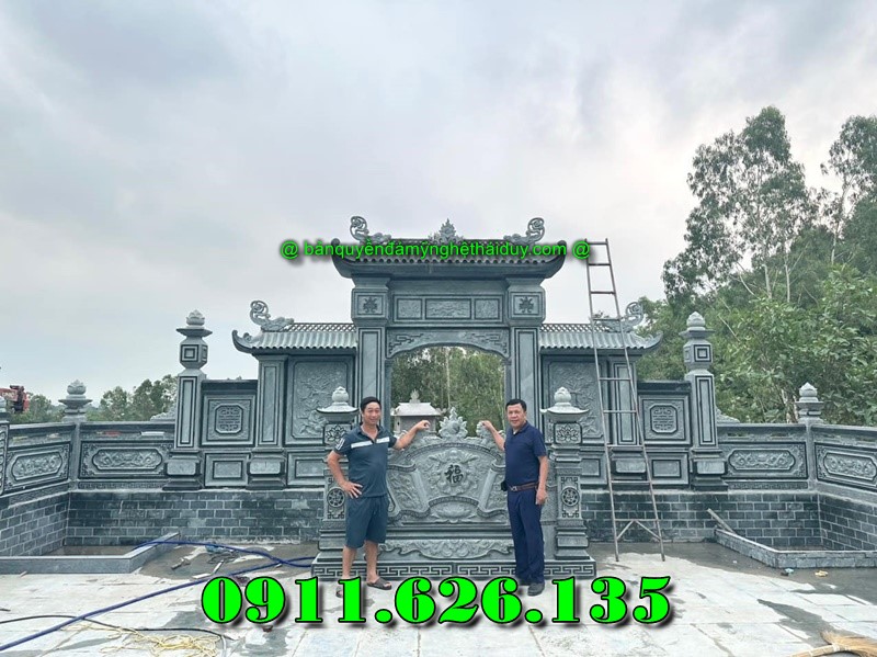 Cổng đá: Cổng tam quan, cổng mái vòm khắc họa tiết truyền thống.