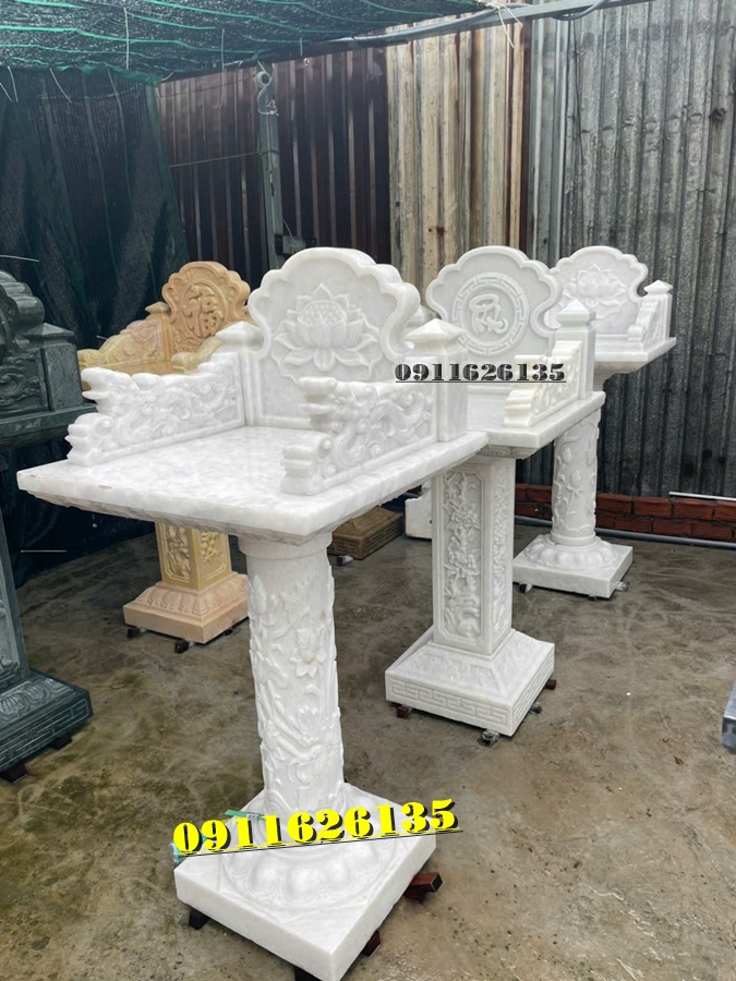 Cấu tạo: Gồm mặt bàn (đặt lễ vật), chân cột hoặc bệ đỡ, nhiều mẫu có chạm khắc hoa văn tứ linh, hoa sen, mây trời,…