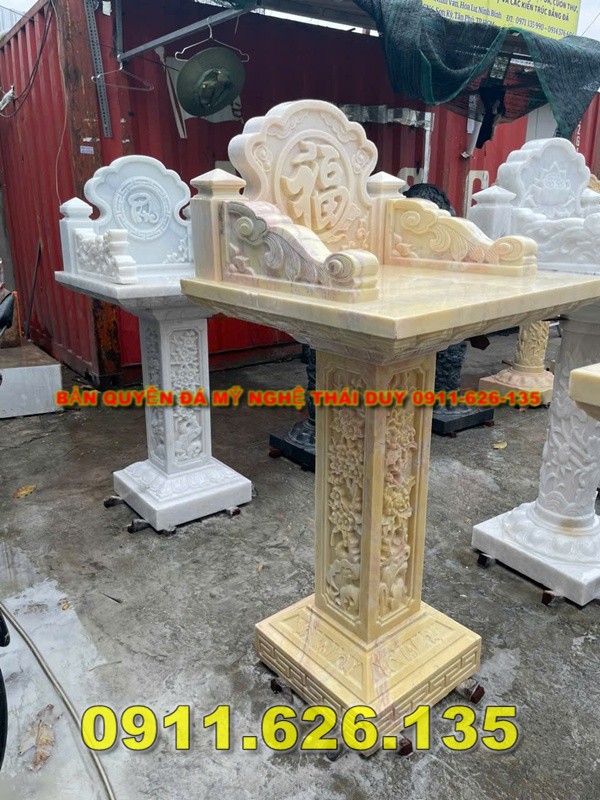 Cấu tạo: Gồm mặt bàn (đặt lễ vật), chân cột hoặc bệ đỡ, nhiều mẫu có chạm khắc hoa văn tứ linh, hoa sen, mây trời,…