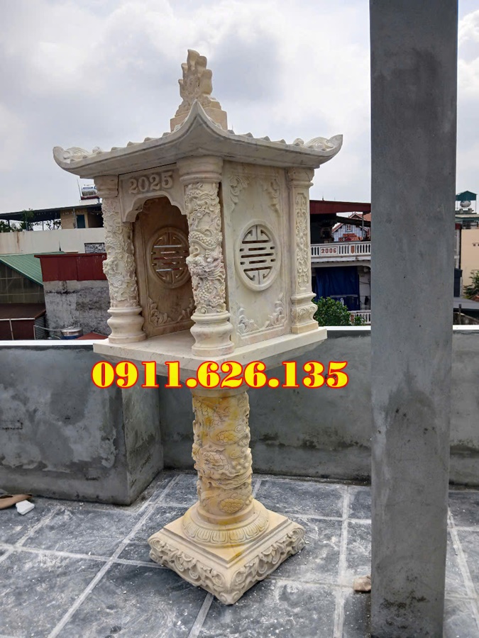 | 147 x 107 x 107 cm | Có mái 2 tầng, cột chạm rồng, đế sen – thường thờ Thần Linh |