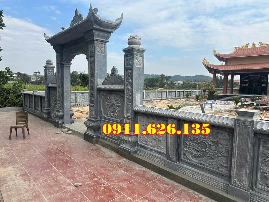 Cổng đá: Cổng tam quan, cổng mái vòm khắc họa tiết truyền thống.