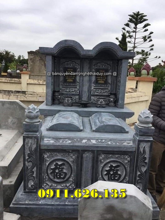 Mộ đôi dành cho hai người, thường là vợ chồng, thể hiện sự gắn kết vĩnh cửu. Thiết kế đối xứng với mái che và chạm khắc hoa văn tạo nên sự trang trọng.