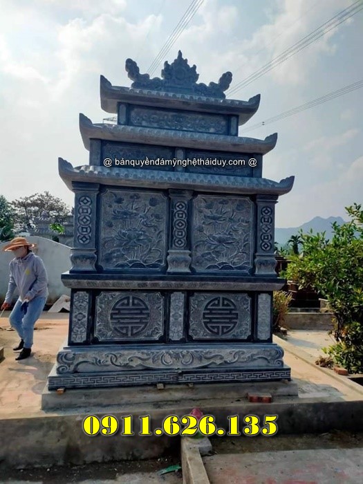 Mộ đá ba mái có ba tầng mái, tượng trưng cho sự uy nghi và đẳng cấp. Thiết kế này thường đi kèm với các hoa văn chạm khắc tinh xảo như tứ linh (long, lân, quy, phụng), thể hiện lòng thành kính cao độ.