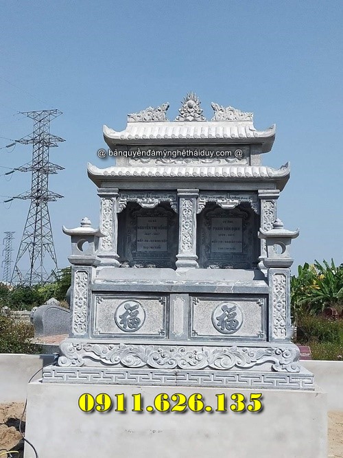 Mộ đôi dành cho hai người, thường là vợ chồng, thể hiện sự gắn kết vĩnh cửu. Thiết kế đối xứng với mái che và chạm khắc hoa văn tạo nên sự trang trọng.