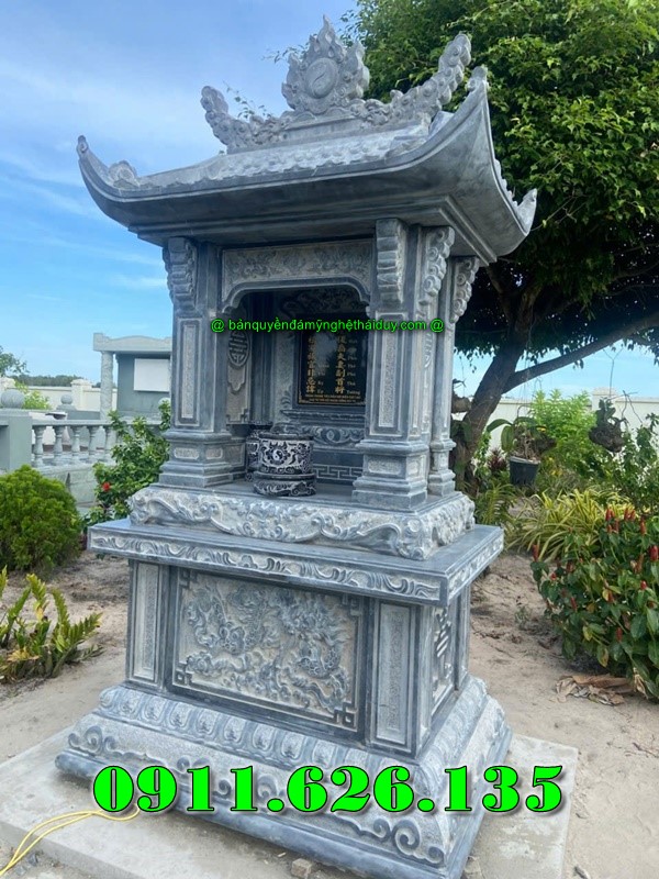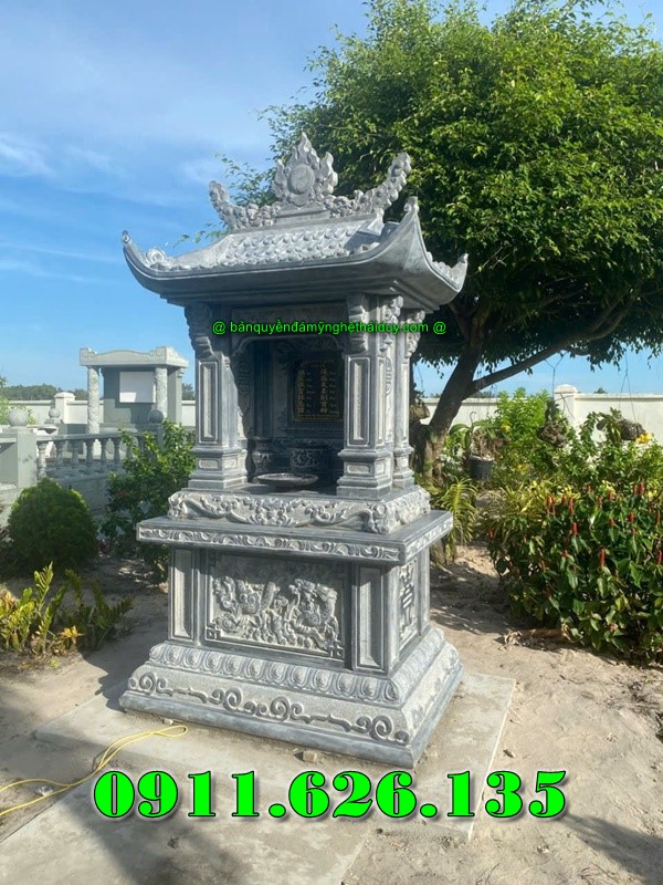 Mẫu Bàn Thờ Thiên Đá Xanh, Mẫu Miếu bàn thờ ngoài trời có đế tiếp xúc mặt đất chân quỳ thể hiện sự uy nghi nơi thờ cúng, cấu tạo đơn giản vừa phải tinh tế làm nổ bật lên các phần hoa văn điểm nhấn như chữ thọ tròn, hổ phù và có 1 mái chùa vũng chắc.