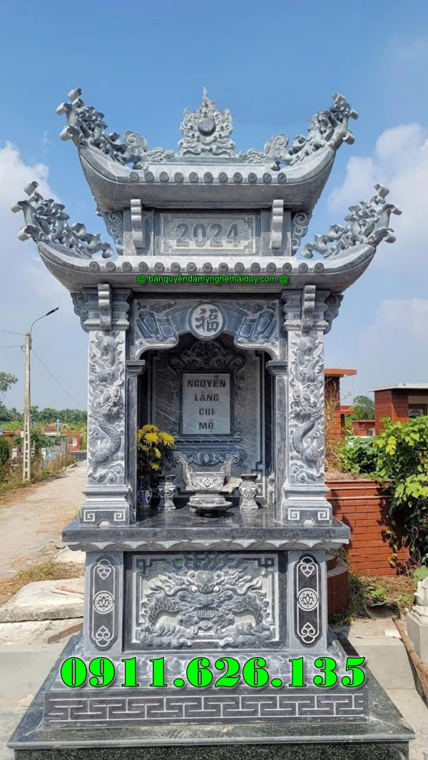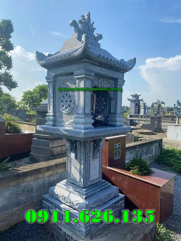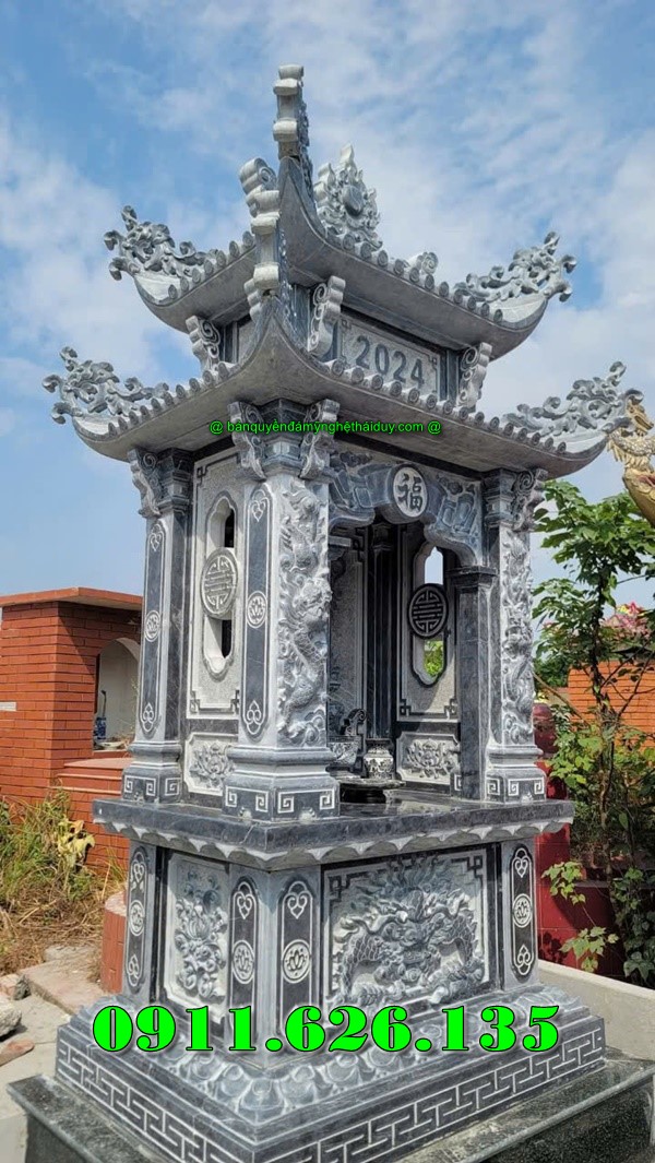 Mẫu Bàn Thờ Thiên Đá Xanh, Mẫu Miếu bàn thờ ngoài trời có đế tiếp xúc mặt đất chân quỳ thể hiện sự uy nghi nơi thờ cúng, cấu tạo đơn giản vừa phải tinh tế làm nổ bật lên các phần hoa văn điểm nhấn như chữ thọ tròn, hổ phù và có 1 mái chùa vũng chắc.
