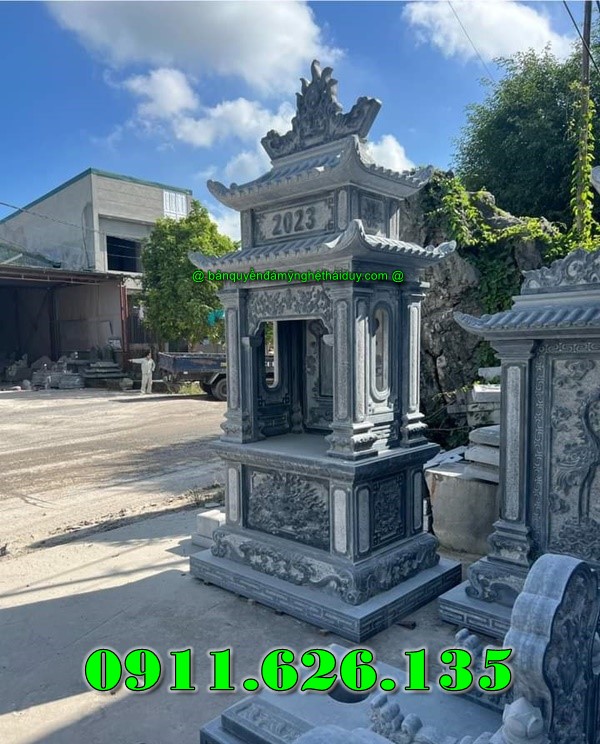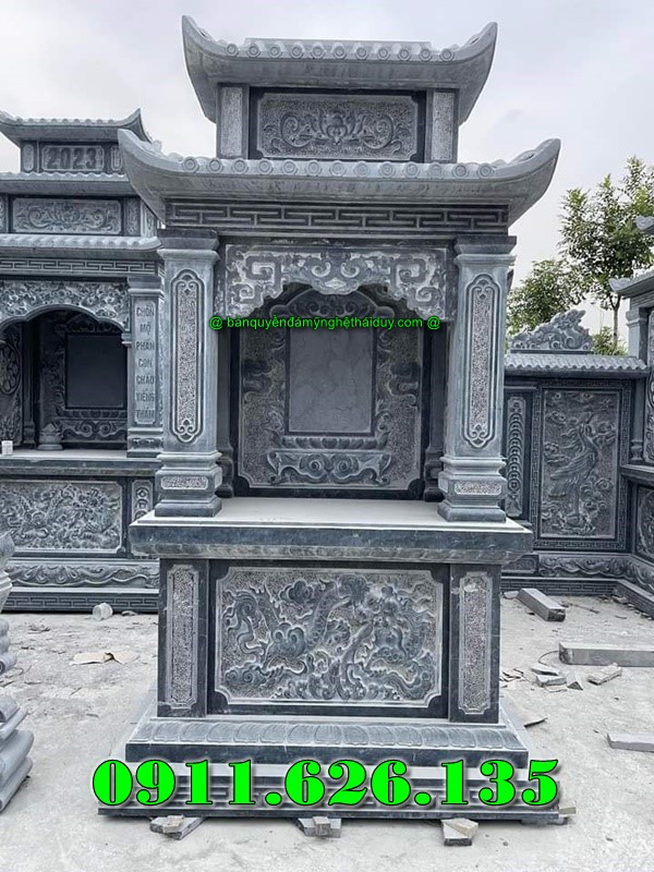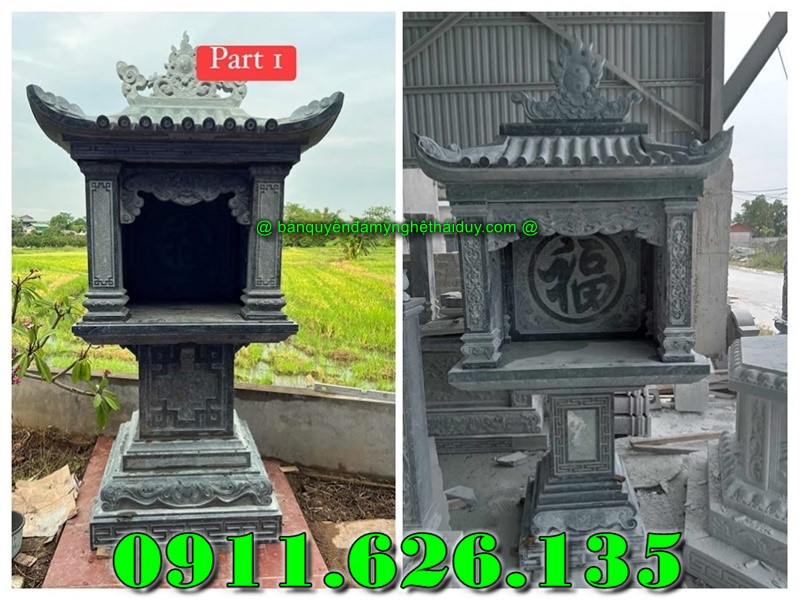 Mẫu Bàn Thờ Thiên Đá Xanh, Mẫu Miếu bàn thờ ngoài trời có đế tiếp xúc mặt đất chân quỳ thể hiện sự uy nghi nơi thờ cúng, cấu tạo đơn giản vừa phải tinh tế làm nổ bật lên các phần hoa văn điểm nhấn như chữ thọ tròn, hổ phù và có 1 mái chùa vũng chắc.