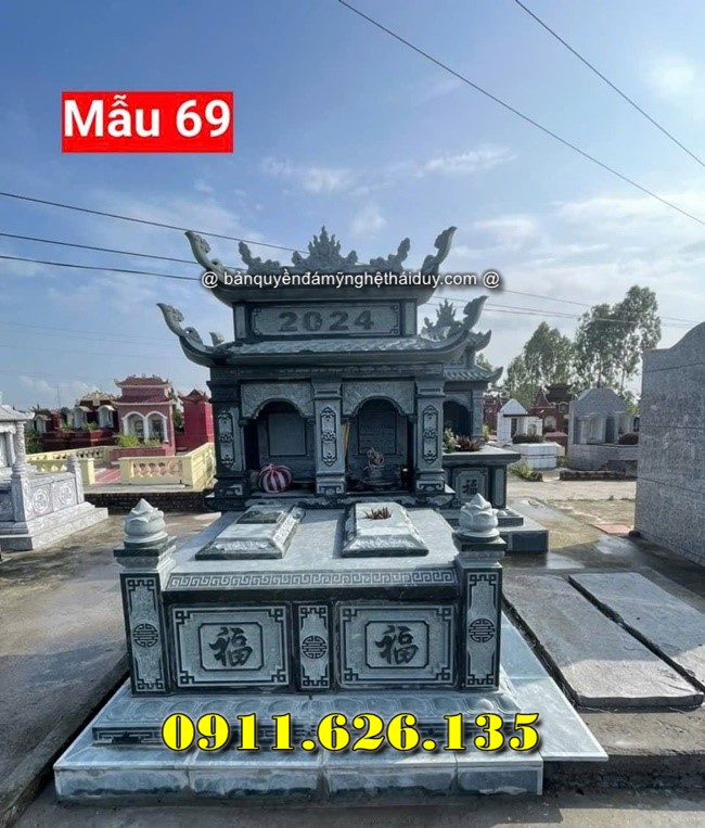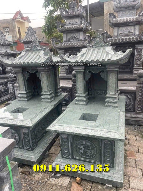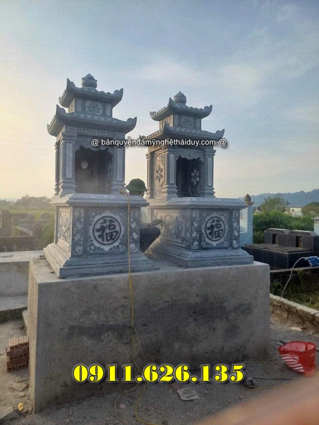 Mộ đôi dành cho hai người, thường là vợ chồng, thể hiện sự gắn kết vĩnh cửu. Thiết kế đối xứng với mái che và chạm khắc hoa văn tạo nên sự trang trọng.