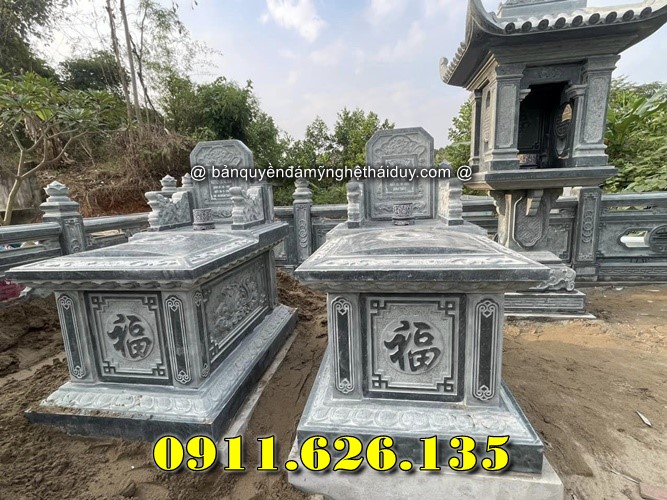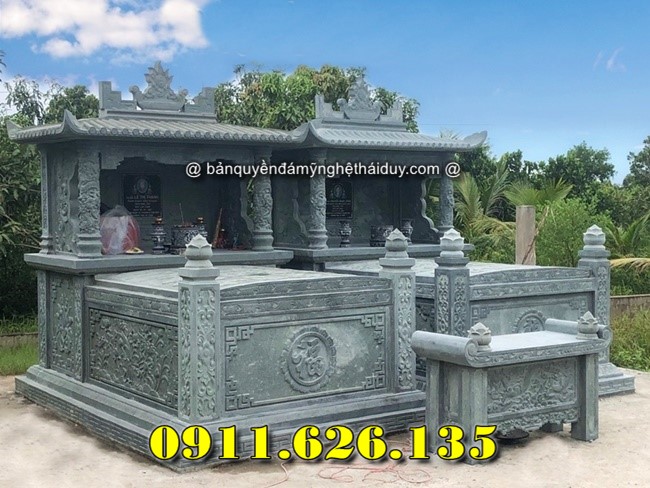 Mộ đôi dành cho hai người, thường là vợ chồng, thể hiện sự gắn kết vĩnh cửu. Thiết kế đối xứng với mái che và chạm khắc hoa văn tạo nên sự trang trọng.