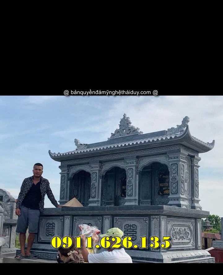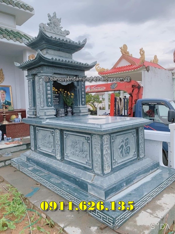 Mộ đá xanh hai mái là kiểu mộ được thiết kế với hai lớp mái chồng lên nhau, tạo điểm nhấn kiến trúc và tăng tính thẩm mỹ. Phần mái thường được làm cong nhẹ theo phong cách truyền thống, kết hợp hoa văn chạm khắc tinh xảo.