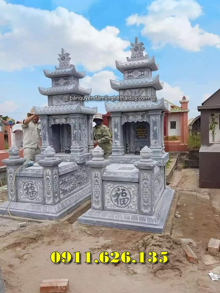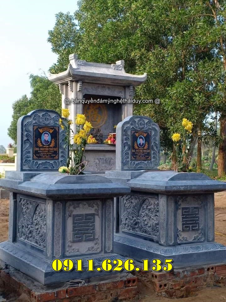 Mộ đôi dành cho hai người, thường là vợ chồng, thể hiện sự gắn kết vĩnh cửu. Thiết kế đối xứng với mái che và chạm khắc hoa văn tạo nên sự trang trọng.