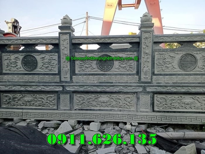 Tường bao có thể được thiết kế dạng lan can đá thoáng hoặc tường kín, kết hợp các trụ đá vững chắc. Hoa văn thường được chạm khắc nhẹ nhàng nhưng tinh tế, tạo cảm giác đồng bộ với toàn bộ công trình.