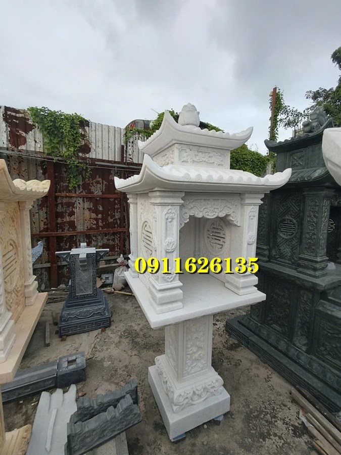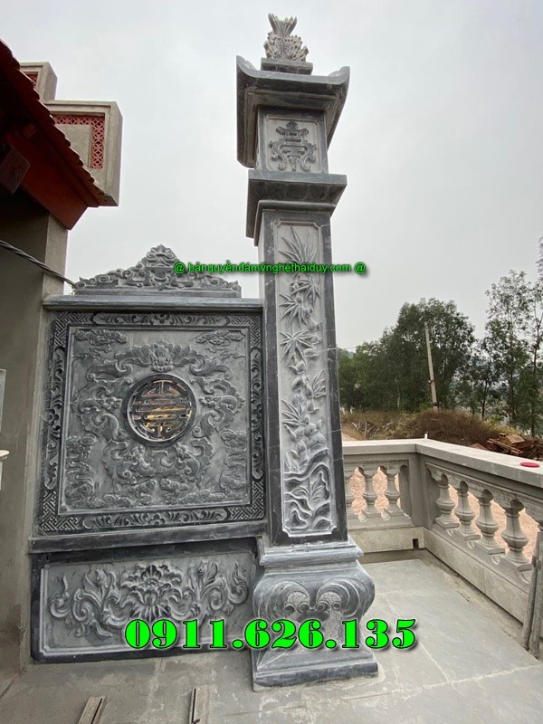 Trên thân cột thường khắc câu đối, trên đỉnh có đèn hoặc búp sen, mang ý nghĩa dẫn lối và thu hút năng lượng tốt.