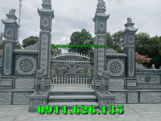 Cổng thường được chế tác từ đá nguyên khối, với các đường nét chạm khắc tinh xảo như rồng, phượng, hoa sen hoặc câu đối chữ Hán mang ý nghĩa tốt lành. Hai bên cổng có thể kết hợp với cột đồng trụ cao, tạo nên một tổng thể cân đối, vững chãi và giàu giá trị nghệ thuật.